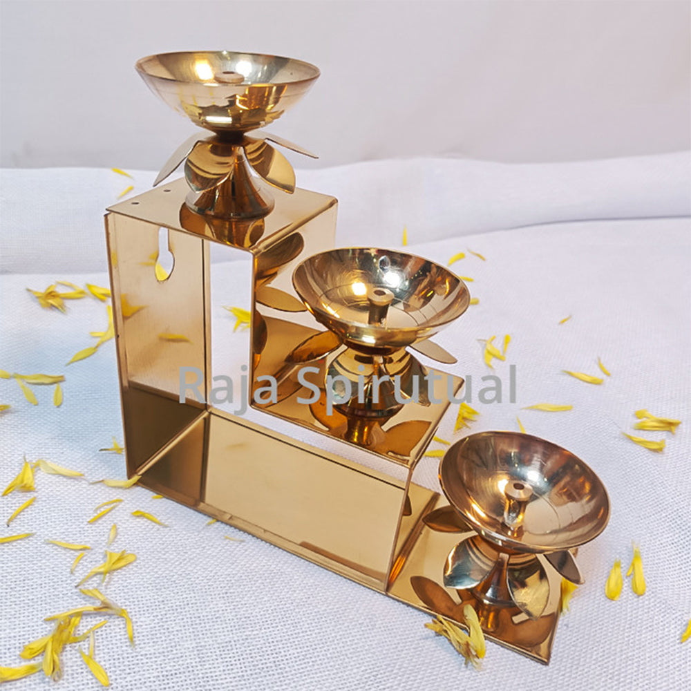 3 Step Vilaku – a beautifully crafted triple-level brass lamp featuring three pyali-style bowls arranged in ascending steps. Each bowl has a center thiri holder with petal-style support, giving a grand and traditional look perfect for puja rooms, festivals, and homams.