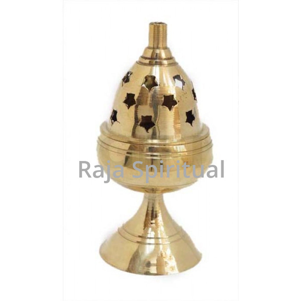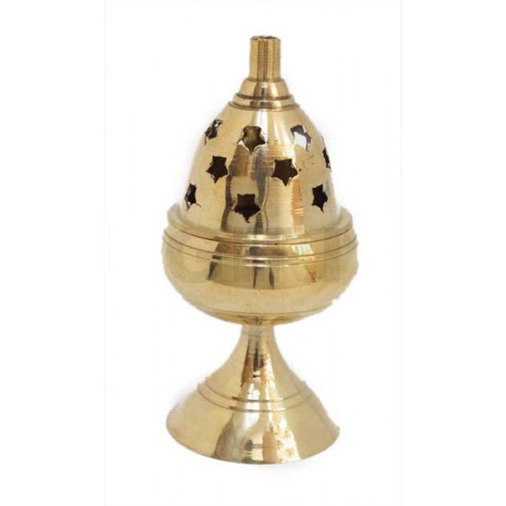 Apple Nandha Vilaku with Stand – compact brass Cup Nandha-style lamp mounted on a sturdy stand. It features star-shaped cut openings on the dome and a deep inner cup that holds oil or ghee with a central thiri holder. The added stand elevates the lamp for stable entrance placement or altar display while providing a long, slow burn.