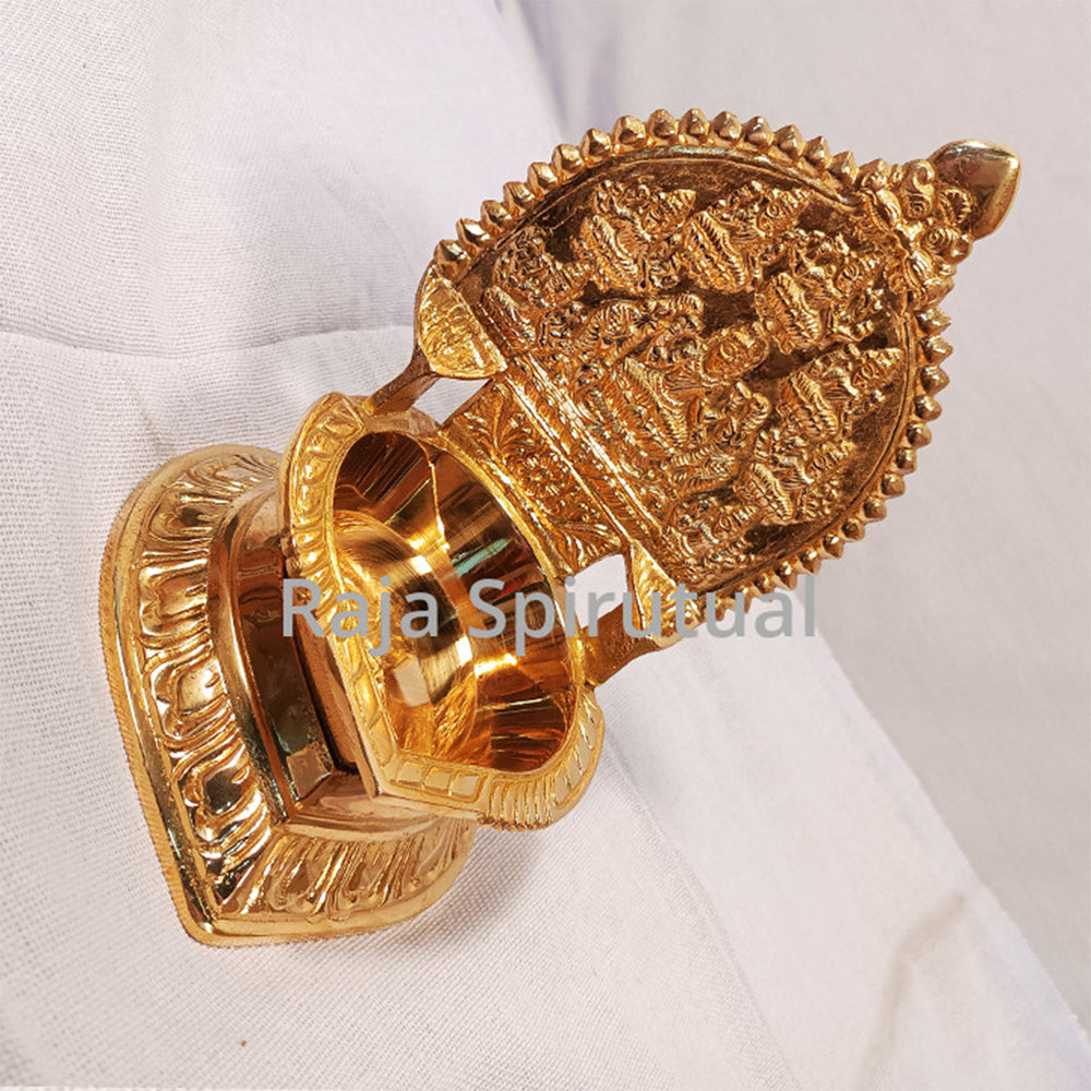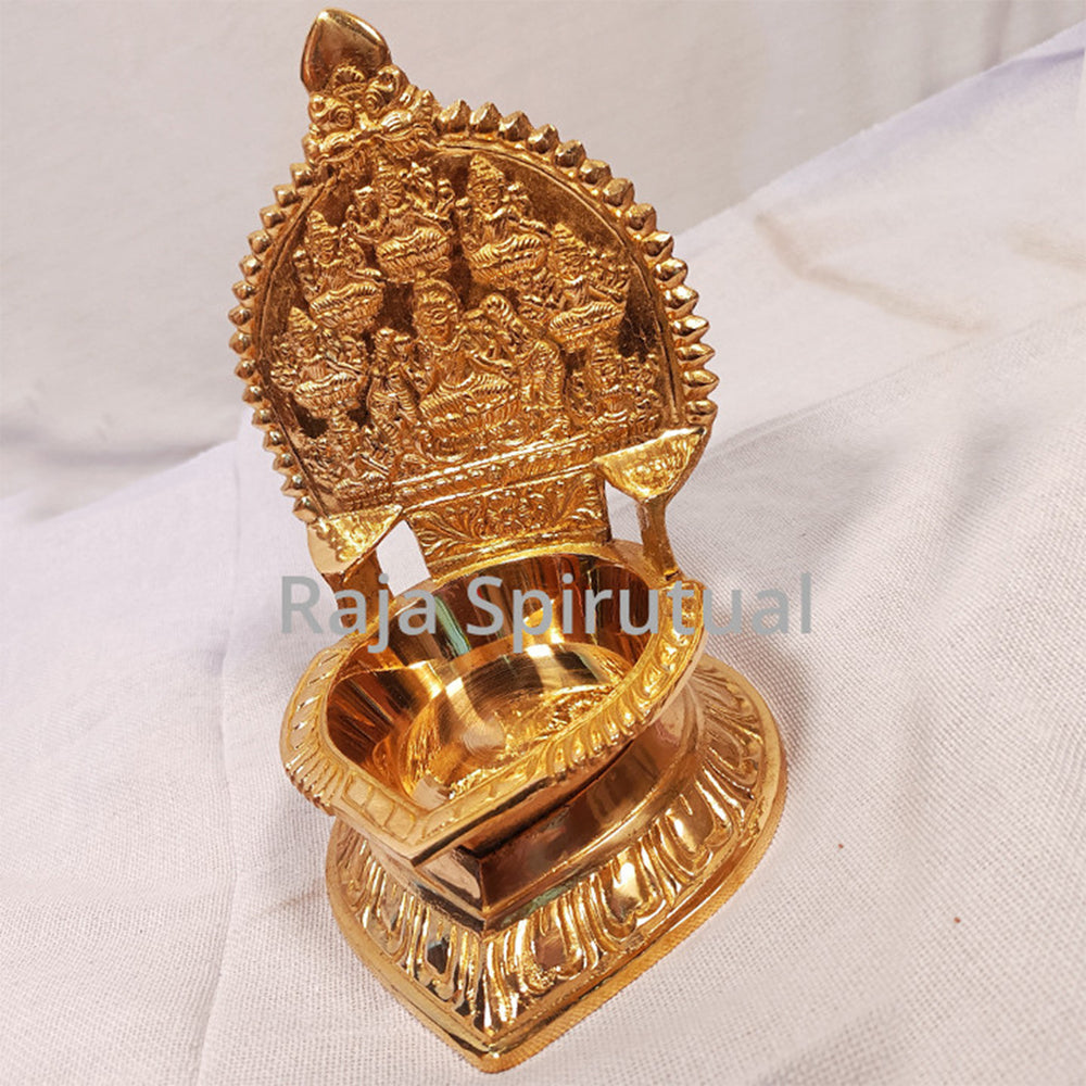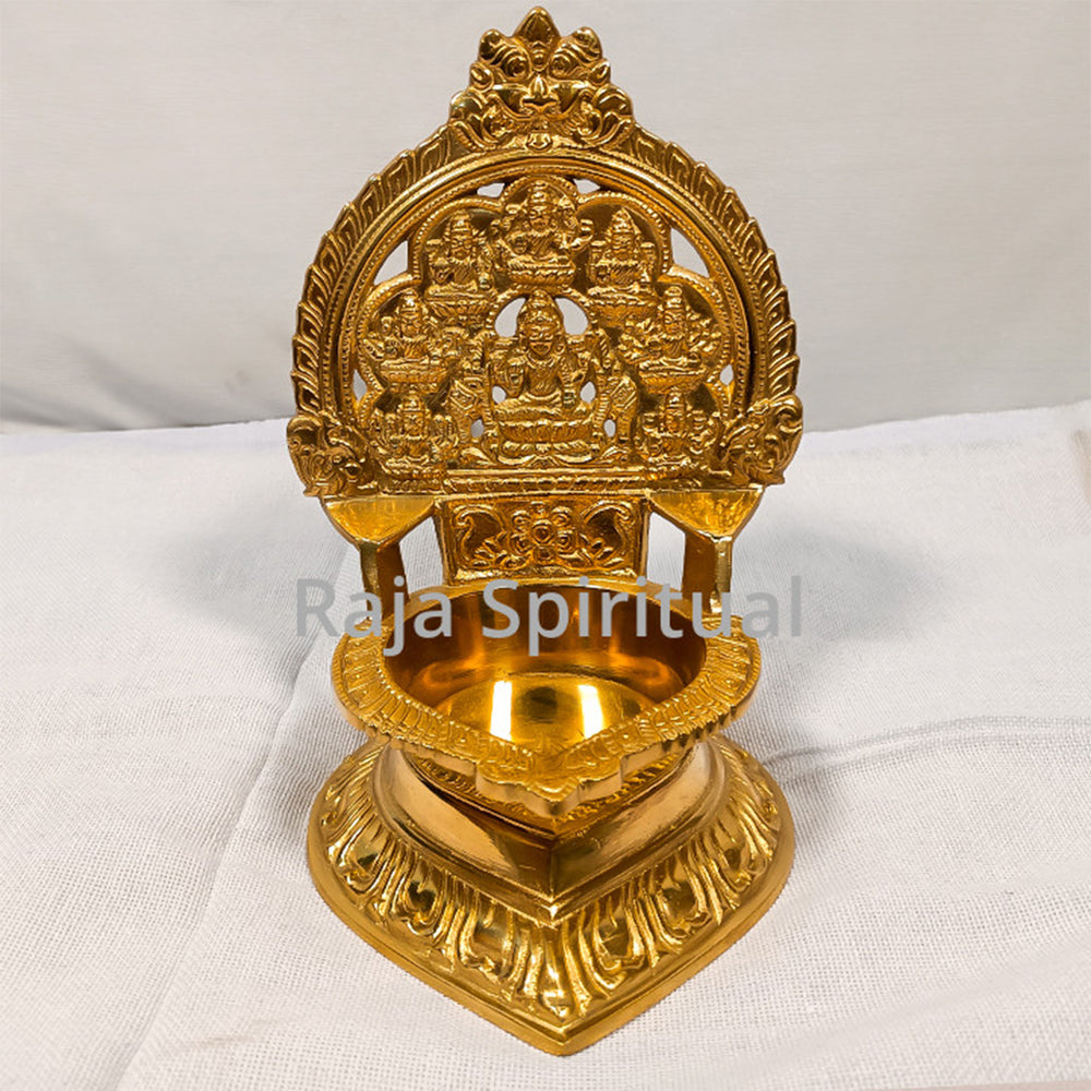 Ashta Lakshmi Vilaku – a traditional brass lamp designed in the style of the Kamatchi Amman vilaku, featuring a raised stand and a deep diya bowl. The backplate carries a beautifully carved central Mahalakshmi figure surrounded by the eight forms of Lakshmi (Ashta Lakshmi), symbolizing divine abundance and blessings.
