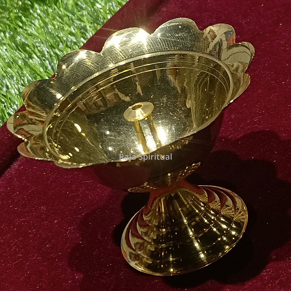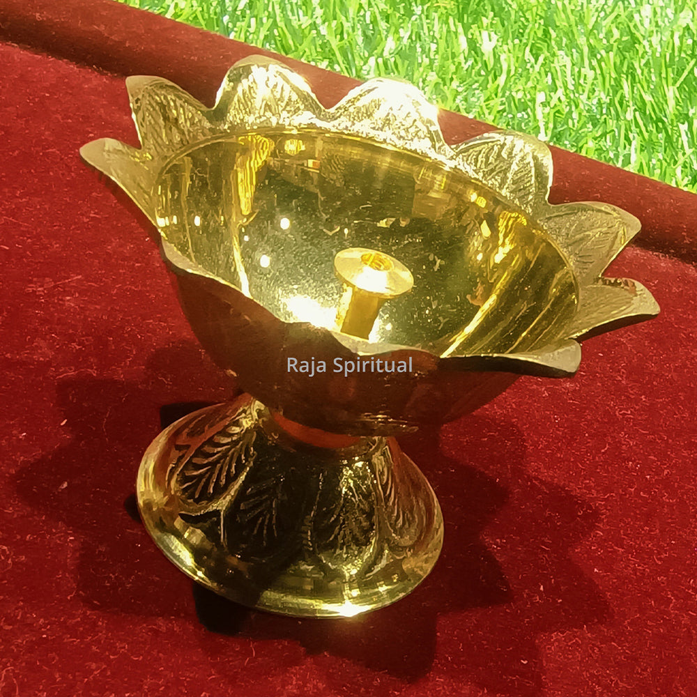 Devadoss Vilaku – traditional flower-shaped brass lamp featuring intricate Naga designs and a central thiri (wick) holder. Ideal for home puja, festivals, and devotional rituals, its ornate design adds sacredness while ensuring steady illumination without oil spillage.