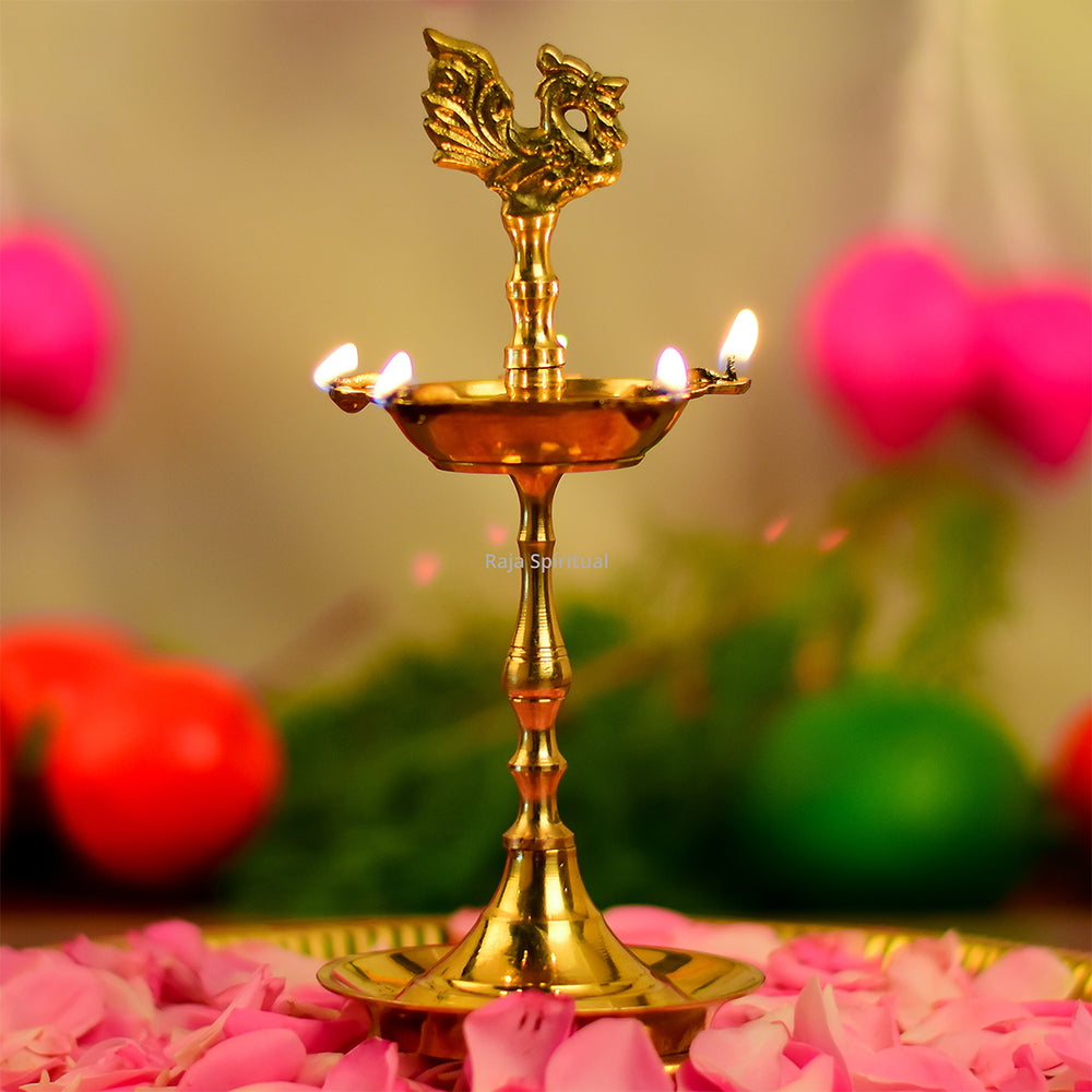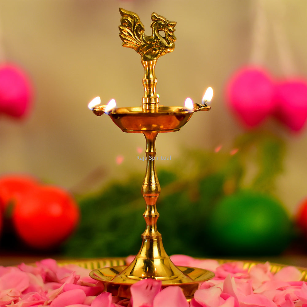 Karaikudi Vilaku – a traditional 5-face brass kuthu vilaku uniquely crafted in the authentic Karaikudi style. It features an elegant Annam (swan) perched on top, representing purity and divine grace. Handcrafted by the skilled artisans of Karaikudi, this lamp carries the heritage, culture, and craftsmanship of Chettinad tradition.