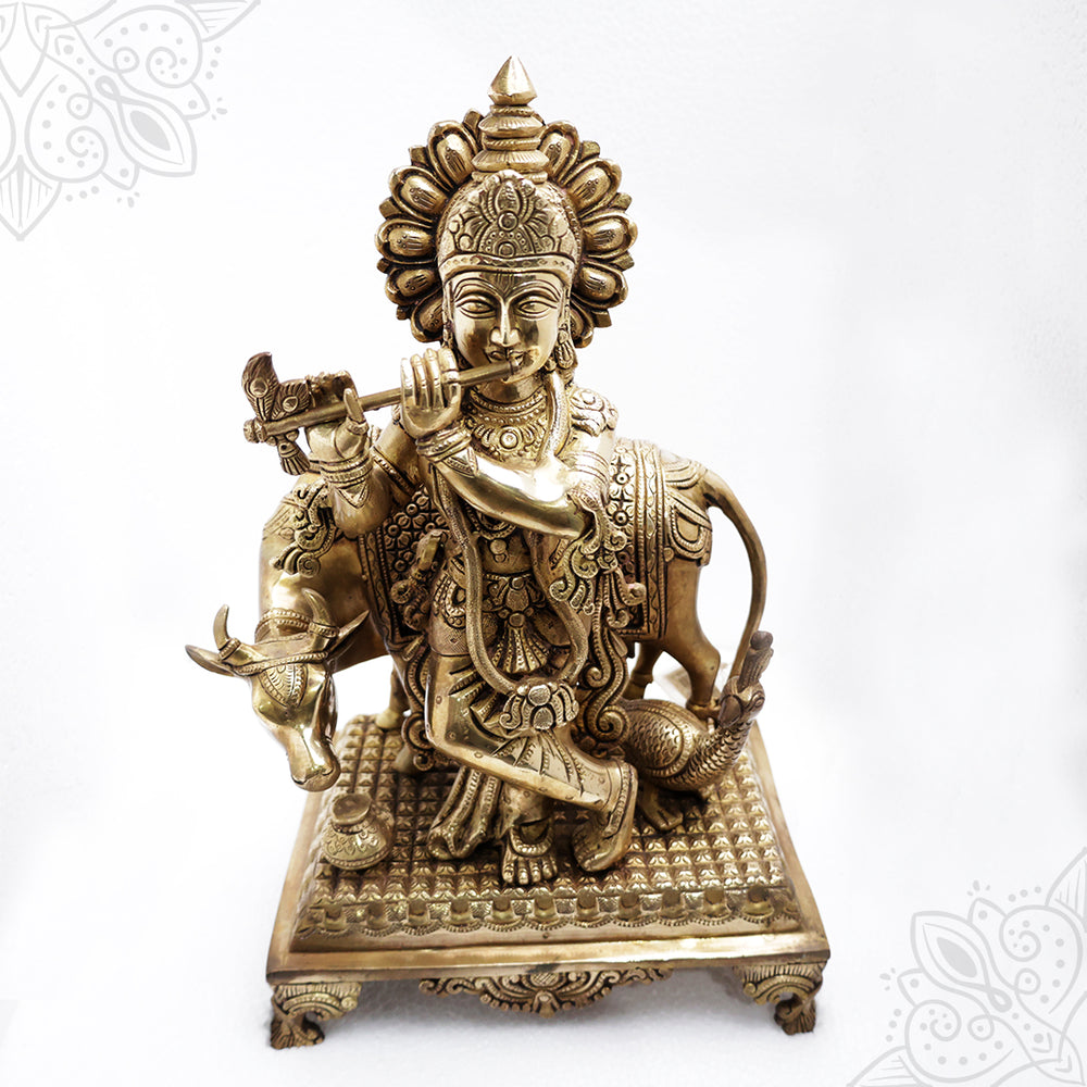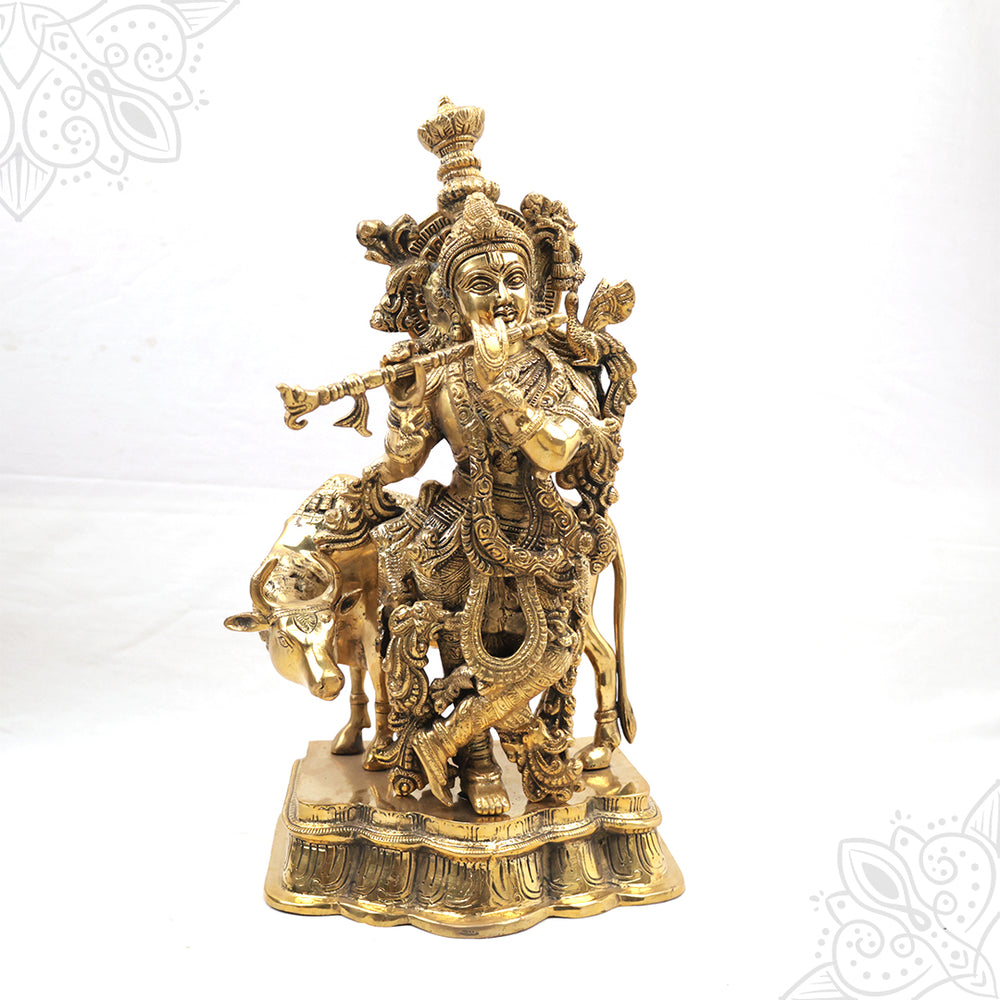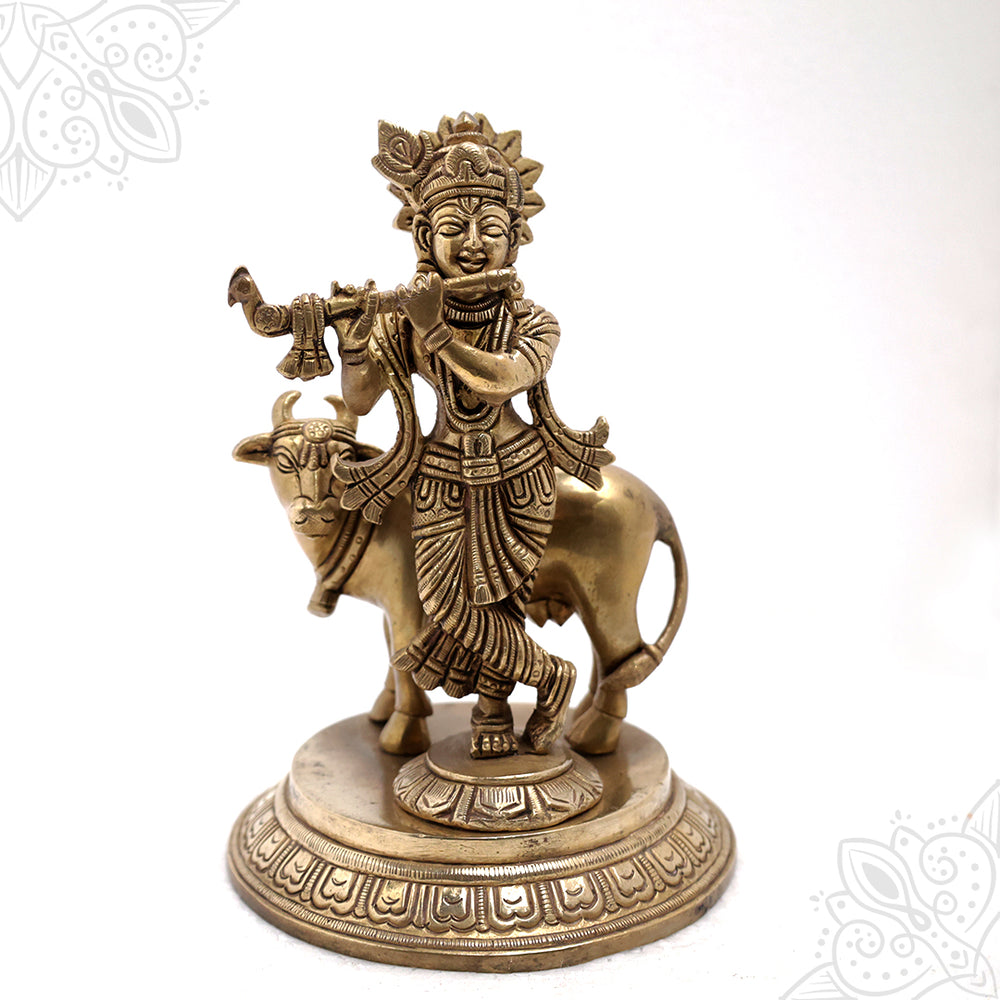 Krishnar with Cow – a beautifully crafted 7.5-inch statue depicting Lord Krishna with his sacred cow, ideal for home puja rooms, temples, and spiritual décor. Represents the divine cowherd, symbolizing love, protection, and devotion, bringing blessings and positive energy to your home.