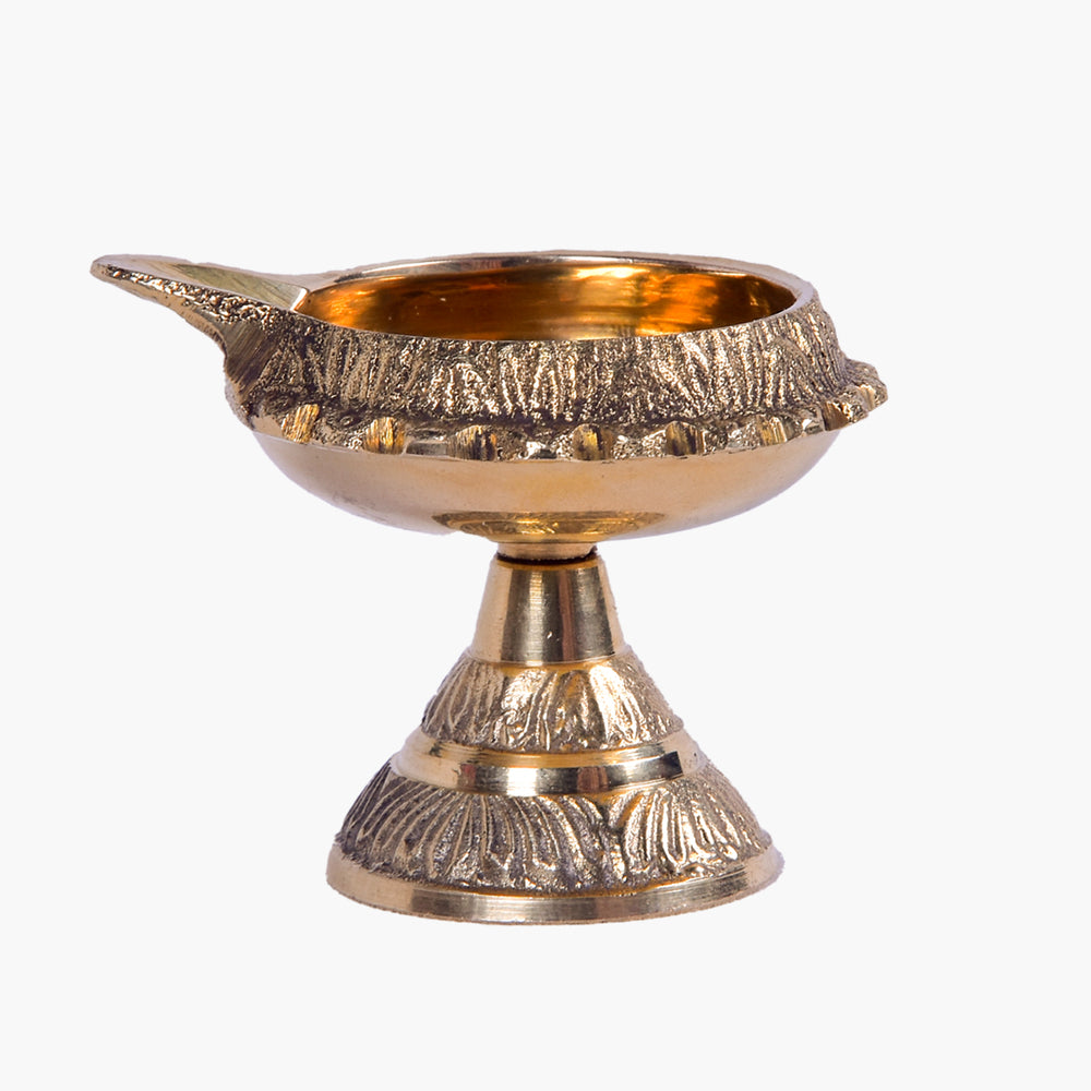 Kuberan Vilakku – brass lamp with a single face and a sturdy stand, traditionally used for Lakshmi and Kubera pujai. Ideal for lighting at nilai vasal and puja room, believed to bring wealth and remove negativity.