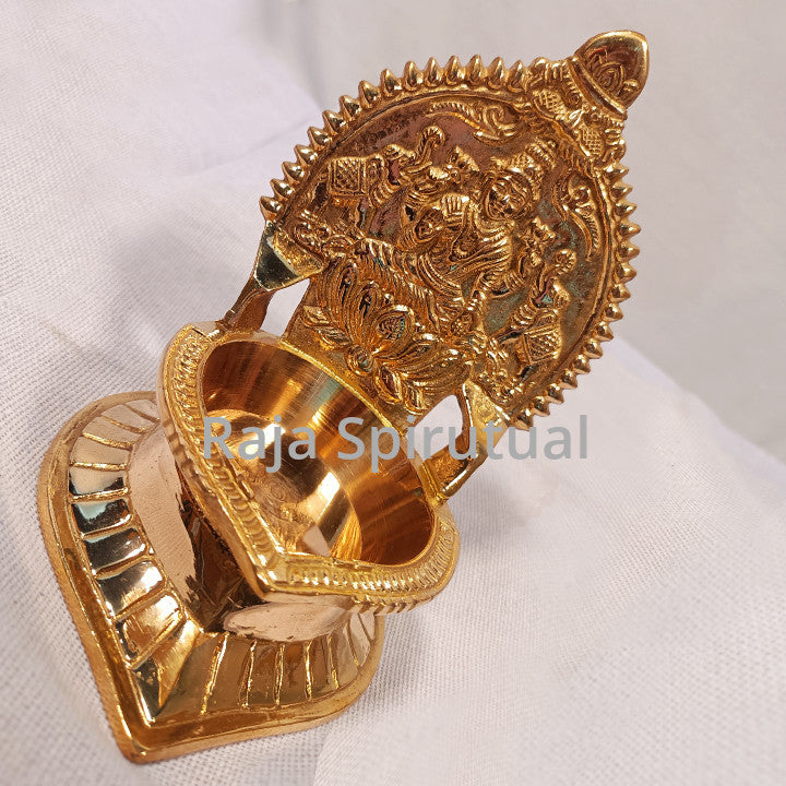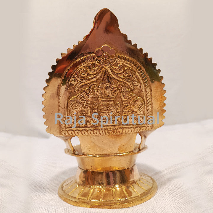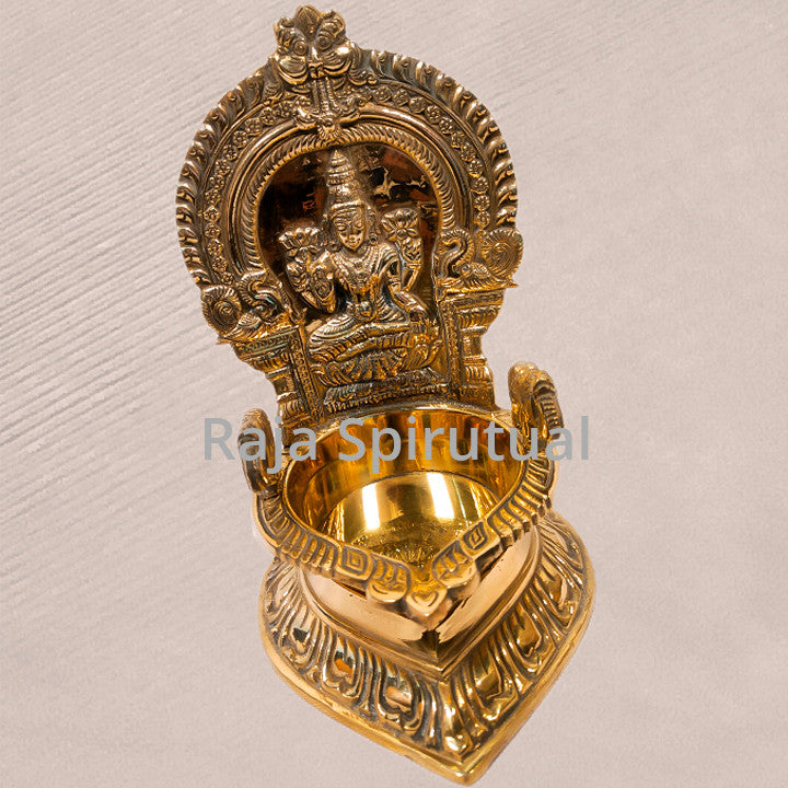 Lakshmi Vilaku – a traditional brass lamp crafted in the Kamatchi Amman style, featuring a sturdy raised stand and deep diya bowl. The backplate showcases Goddess Lakshmi seated gracefully, symbolizing abundance, purity, and divine blessings.