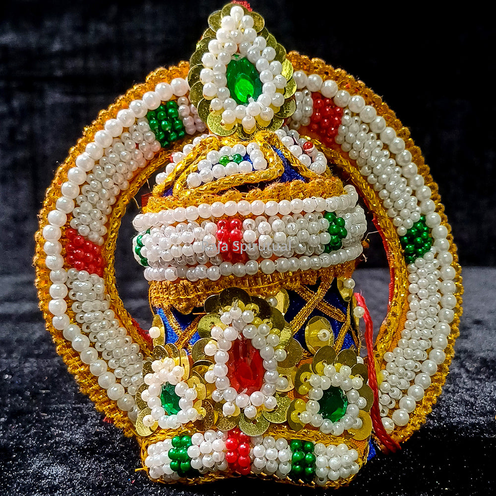 Muthangi Giridam – Chakram, a cloth-based designer crown crafted with high-quality fabric, beads, and decorative stones. Available in 2 inch, 2.5 inch, 4 inch, and 4.5 inch sizes, this Chakram Giridam is designed to adorn the deity’s head during alankaram, giving a majestic, elegant, and complete look to the idol in homes and temples.