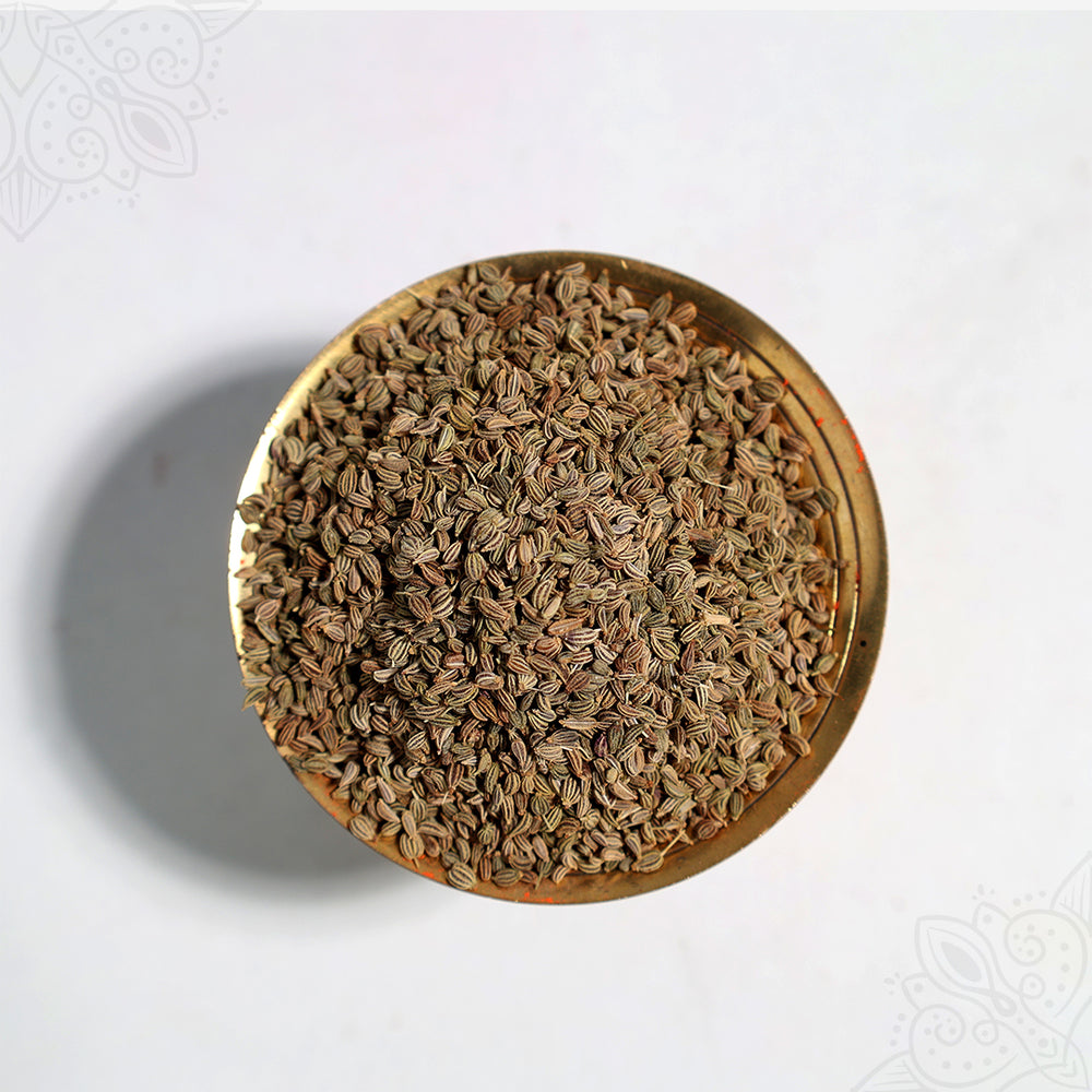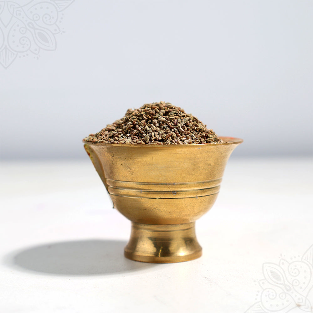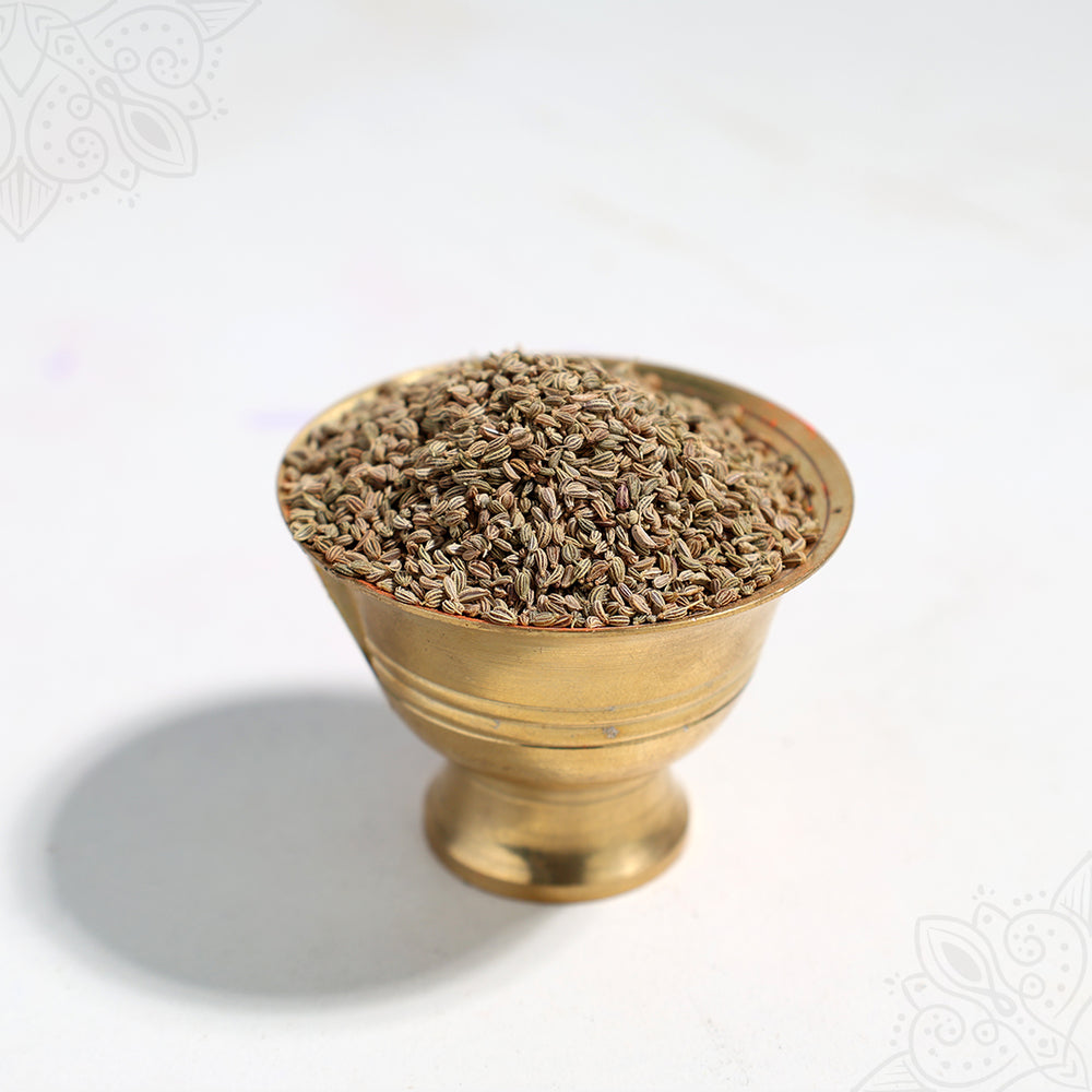 Omam, also known as carom seeds or ajwain, is a small aromatic seed used in Hindu rituals and homa/havan ceremonies to purify the environment and offerings.
