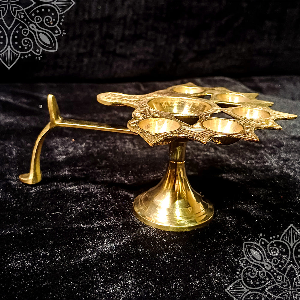 Pancha Aarathi is a sacred five-wick lamp used in temple puja, home puja and homa rituals, offering light and devotion to deities while creating a spiritually uplifting and auspicious atmosphere.