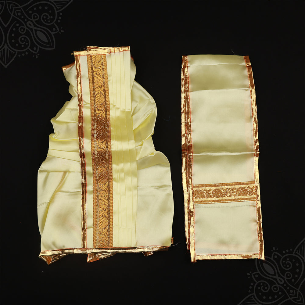 Panchakatcham 24 Inch – is a readymade traditional attire used for decorating Hindu deities. Panchakatcham refers to a ready-to-wear dhothi and thundu set specially designed for Gods such as Vinayagar, Murugar, Perumal, Sivan, Krishnar, Bairavar, and other deities. Made with plain satin cloth and finished with an elegant golden border look, this Panchakatcham enhances the divine beauty of idols during pooja and festivals.