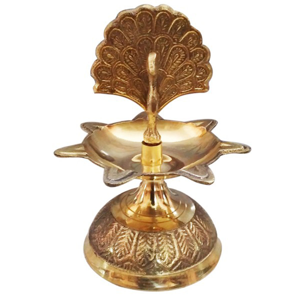 Peacock Vilaku – 1 Step design crafted in brass with a beautiful peacock figure mounted above the lamp. The deepam bowl features 7 faces, allowing you to light 7 thiris at a time for powerful illumination. Comes with a sturdy stand, making it a decorative and divine addition for home pujai, festivals, and special occasions.