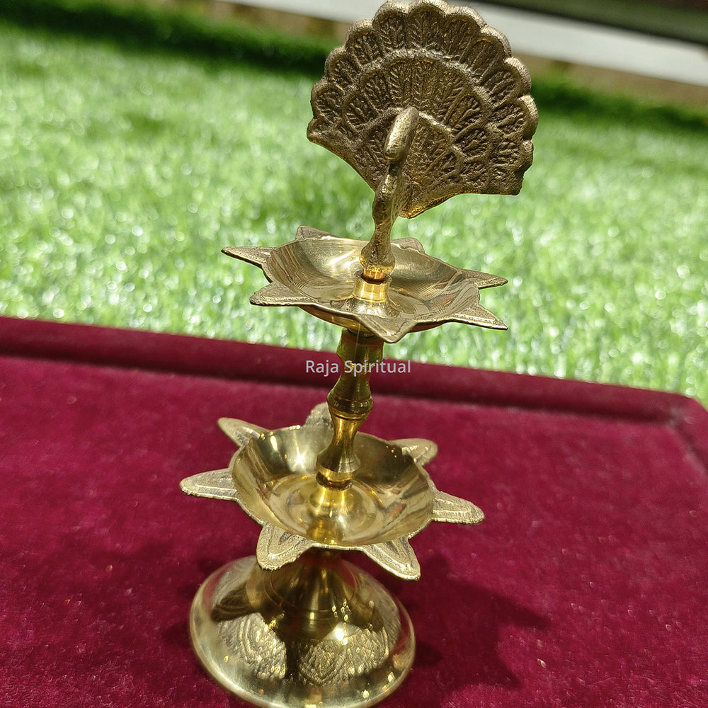 Peacock 2 Step Vilaku – ornate brass two-tier kuthu-vilaku featuring a lower lamp with 7 faces on a sturdy stand, an upper lamp with 7 faces on its own stand above it, and a beautifully crafted peacock figure crowning the top. This multi-level design provides majestic illumination ideal for grand puja setups, festivals, and traditional home altars.
