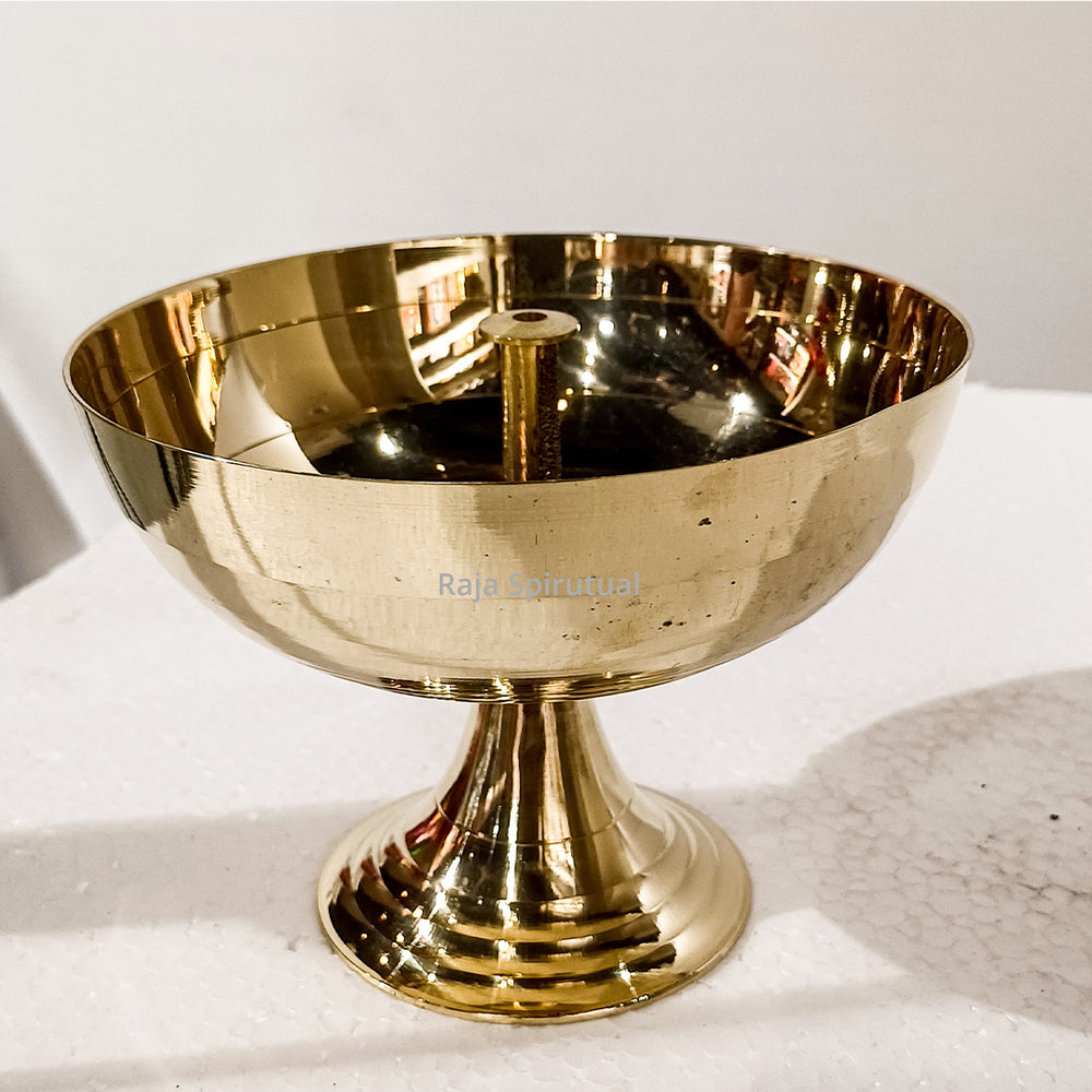 Plain Pyali Vilaku – a simple, undecorated brass bowl-style lamp with a central thiri (wick) holder. With no patterns or embellishments, this lamp offers a clean and traditional look, perfect for everyday puja lighting and minimalistic spiritual setups.