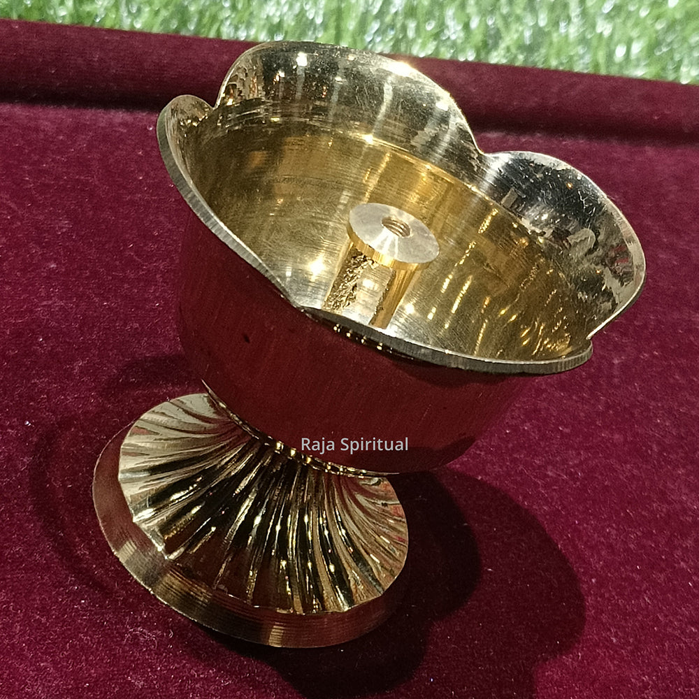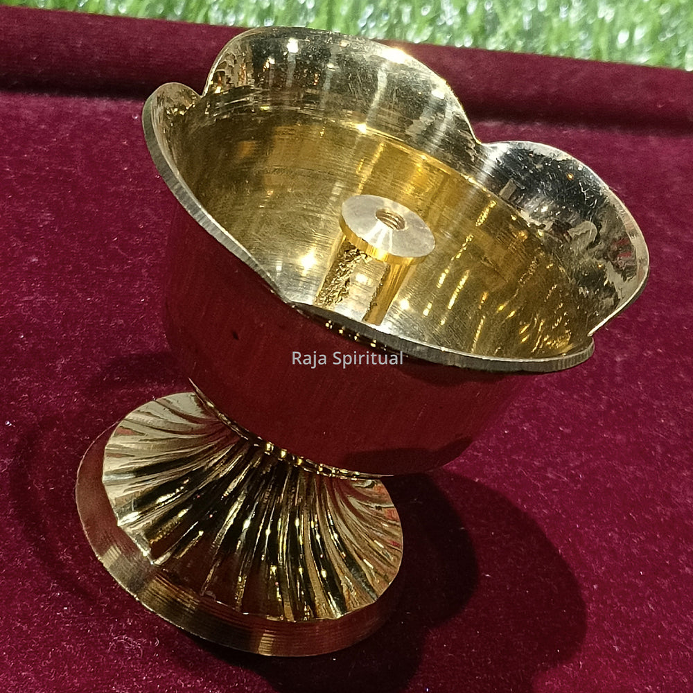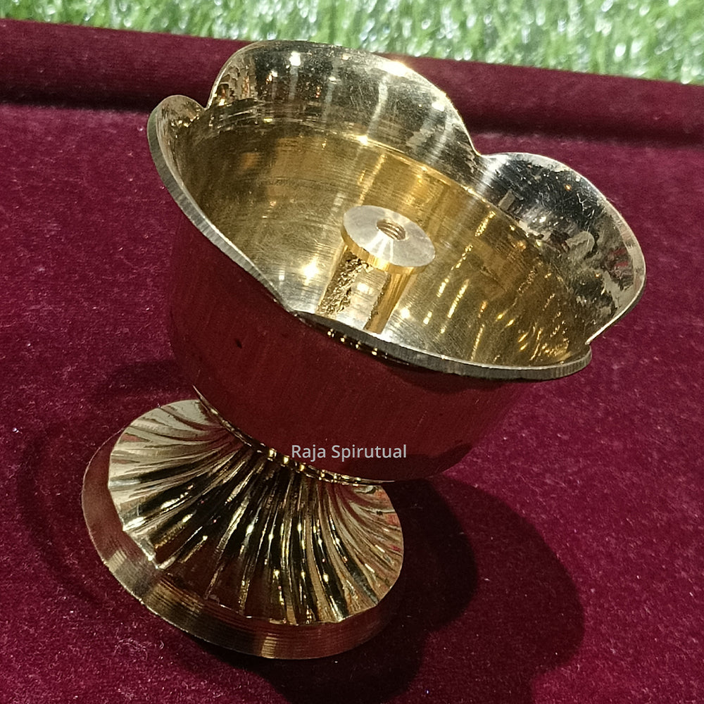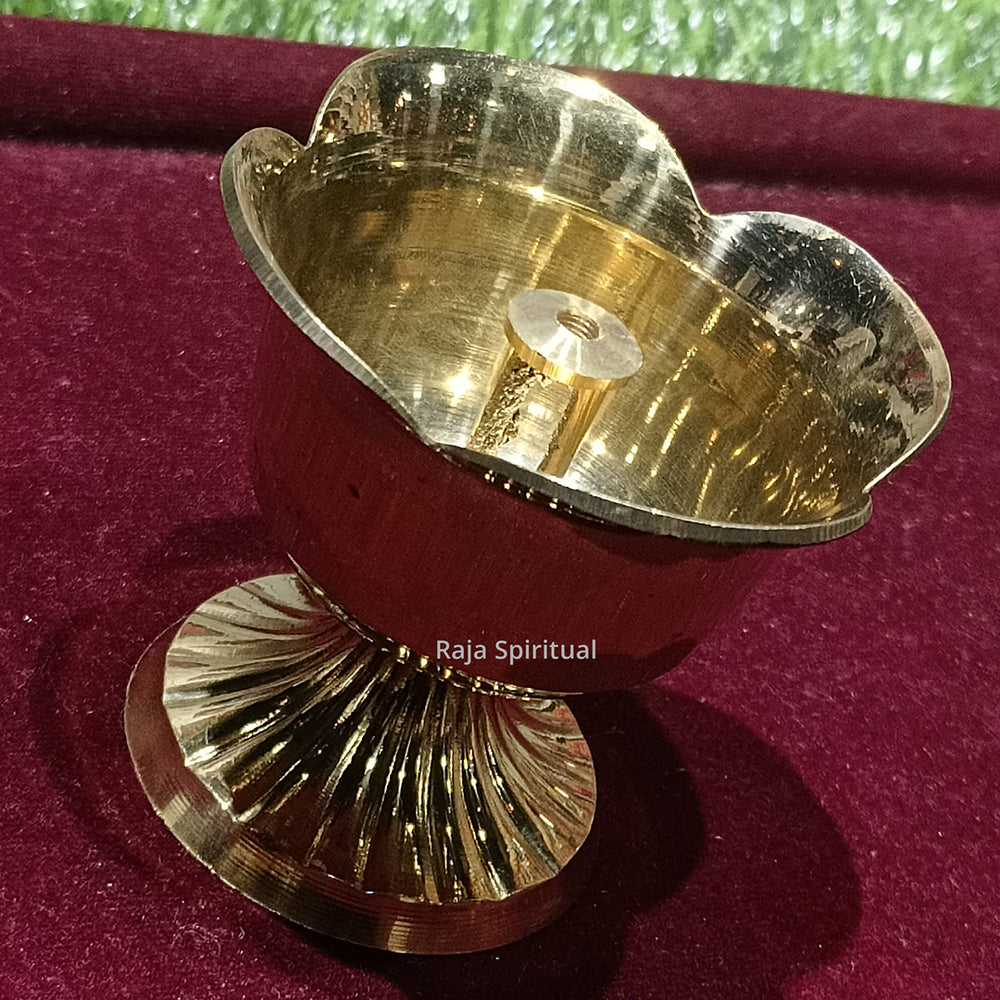 Rose Shaped Vilaku – elegant brass lamp crafted in the form of a blooming rose with a central deepam bowl and a center thiri (wick) holder. Its floral silhouette makes it perfect for puja rooms, Lakshmi puja, festive décor, and as a decorative spiritual piece.