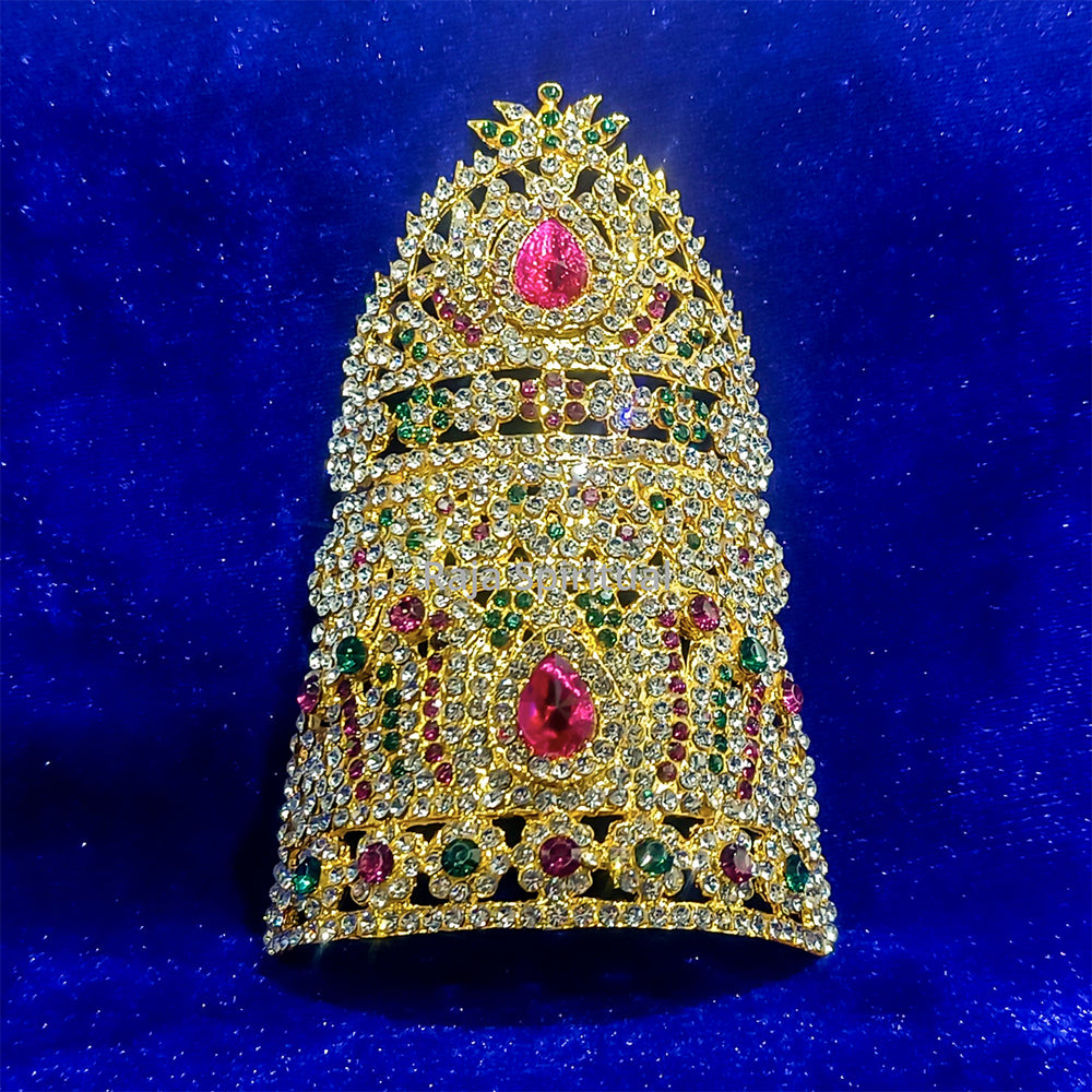 Stone Giridam – Half Size, crafted on a metal-like sturdy base and fully adorned with decorative stones. This half crown is designed to create a majestic and elegant appearance for idol of all sizes, ranging from small 2 inch and 3 inch home idol to larger 2 ft and 3 ft Swamy idol in temples. Carefully arranged large and small stones give a rich, vibrant, and divine look, making the deity’s alankaram truly spectacular.
