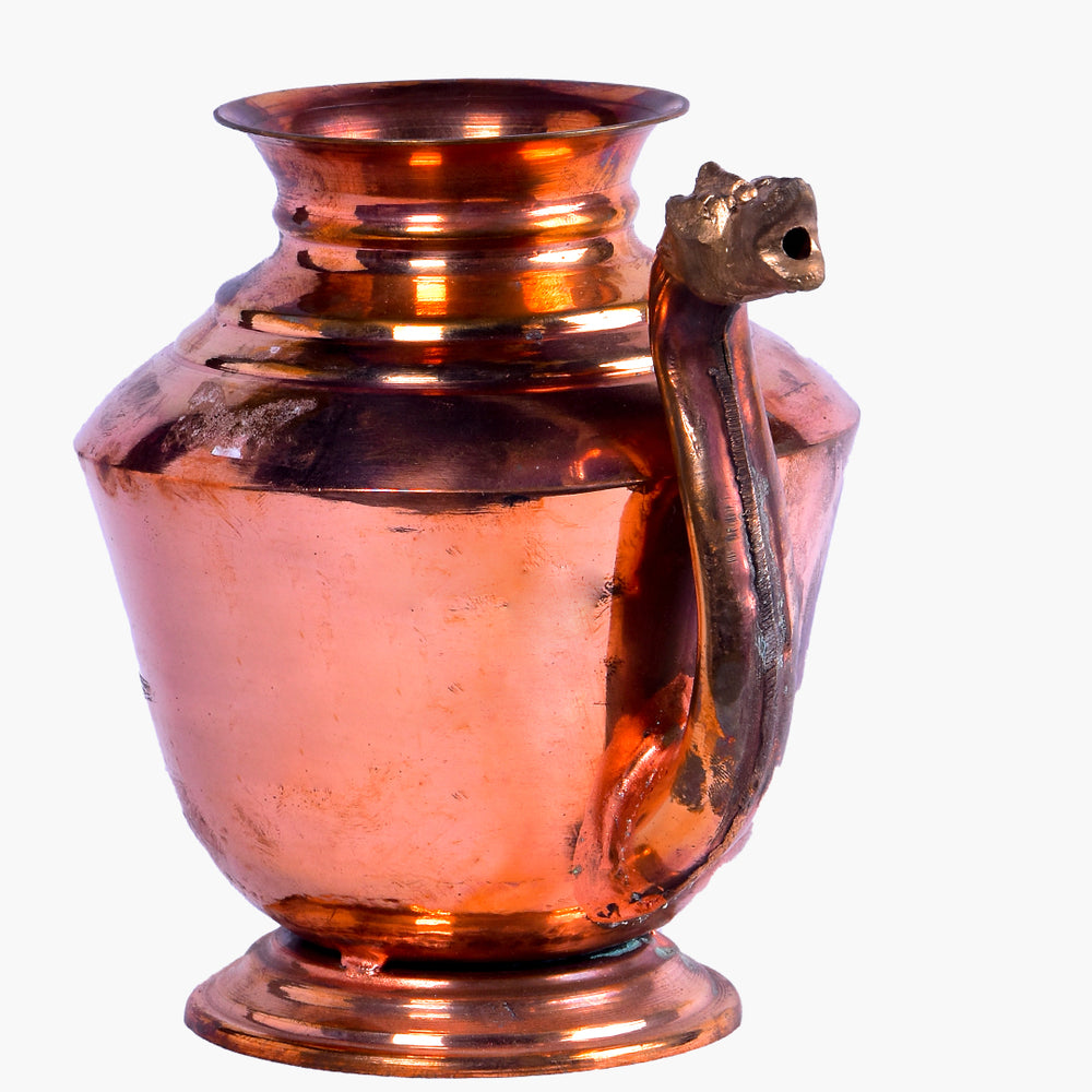 Thirukaveri – sacred copper kettle used in temples and home puja to hold water for abhishegam and ritual pouring. Crafted from high-quality copper, it ensures purity of water and durability while enhancing the spiritual experience. The kettle often features a decorative dragon-shaped handle, symbolizing power, wisdom, and cosmic energy.
