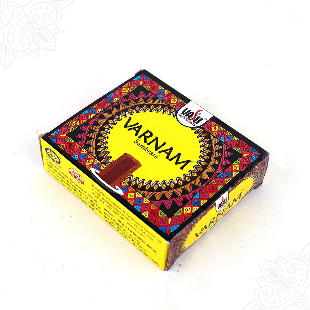 Varnam Sambrani Stem (computer sambrani) is a compressed square piece made from natural sambrani material. It is used in home puja, temple puja, homa, and meditation rituals to produce fragrant, purifying smoke.