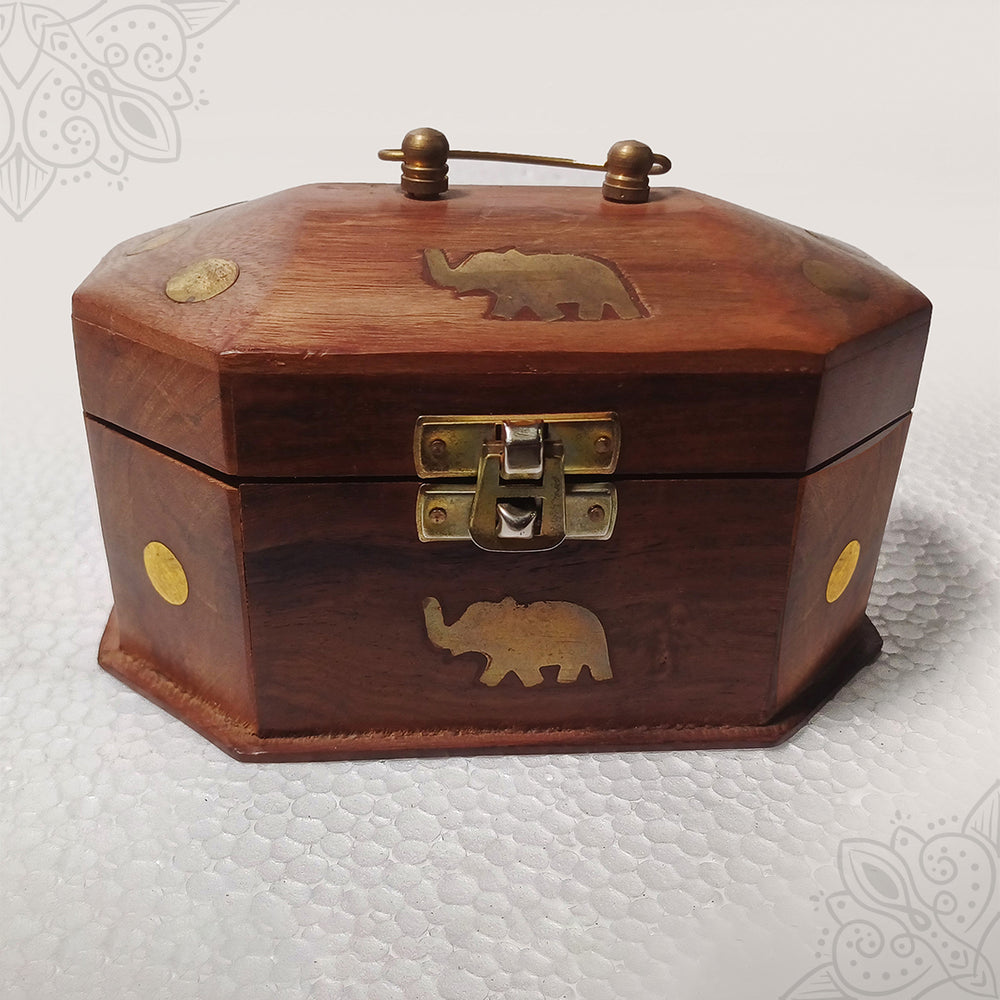 Wooden Jewellery Box - a beautifully crafted wooden box designed for safely storing jewellery, valuables, and small sacred items. Its traditional design adds elegance and charm to dressing tables, cupboards, and puja spaces. Ideal for organizing ornaments while keeping them protected and secure.